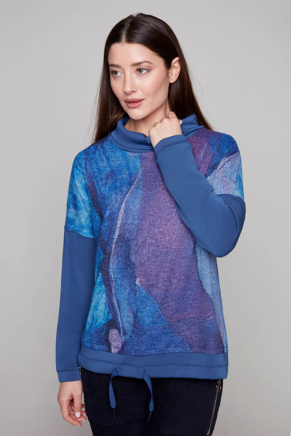 Wrap yourself in artful coziness with this painterly tunic, where deep indigos, violets, and cerulean blues merge in a dynamic abstract print. Crafted in a brushed, soft stretch knit, it features a relaxed silhouette with a modern cowl neckline, drop shoulders, and a drawstring hem to adjust your look. Perfect for effortless pairing with jeans, leggings, or sleek pants.