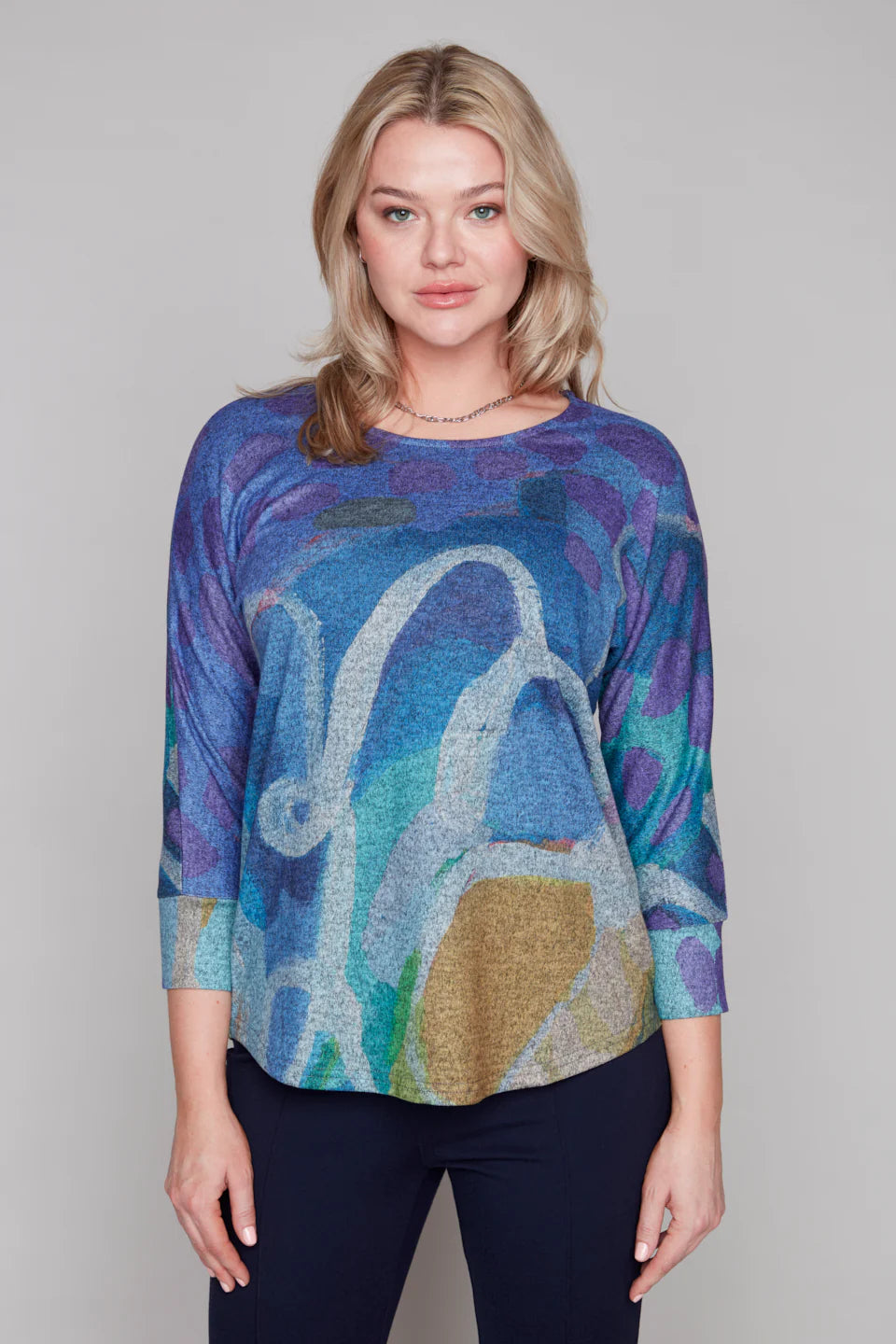 This relaxed knit top features a softer interpretation of Claire Desjardins’ artwork, in muted shades of blue and purple. With its shorter sleeves and understated tones, it offers a lighter take on the season’s artistic vision. Made from a soft stretch fabric, the crew neckline and easy silhouette make it a comfortable, everyday piece with subtle elegance.