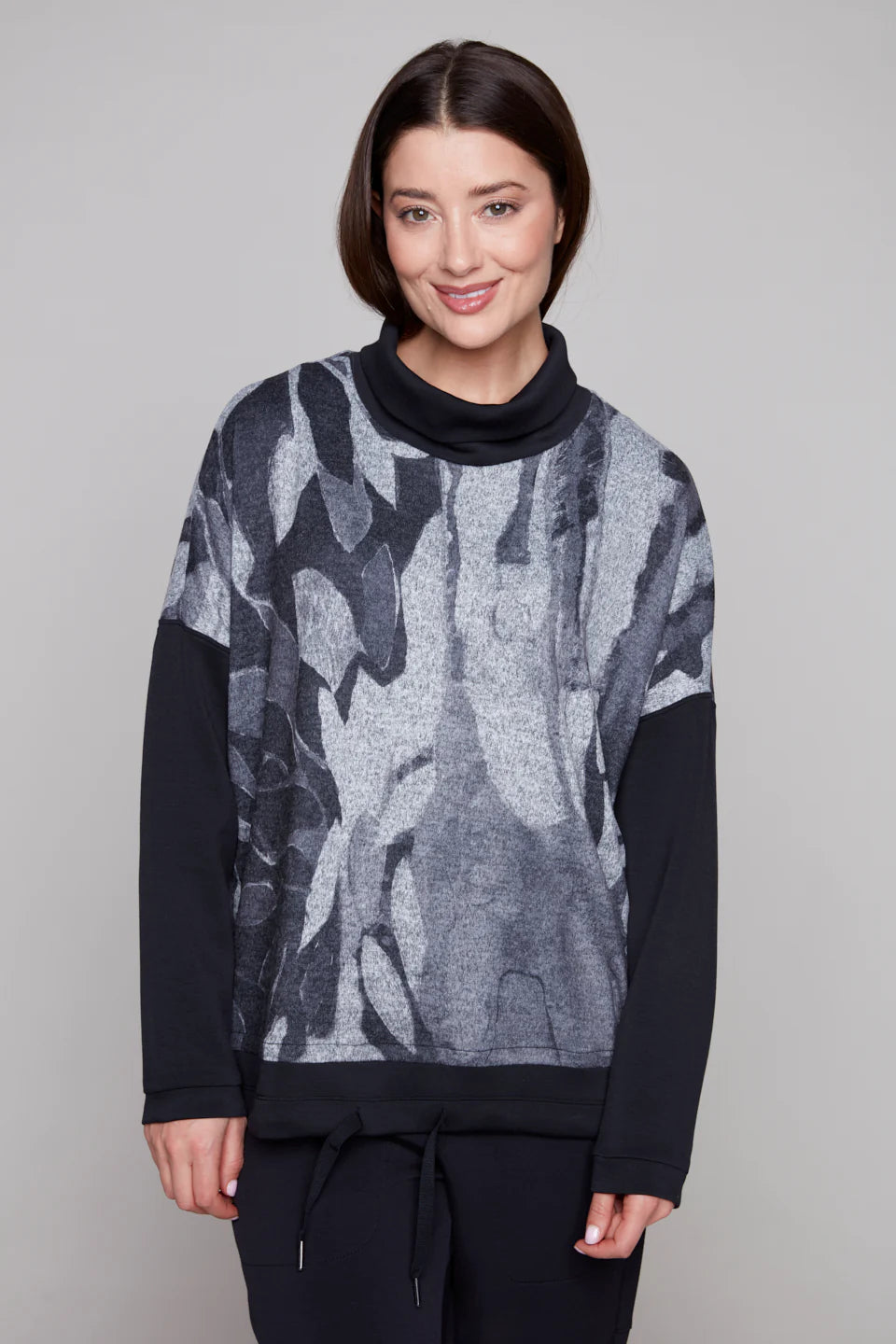This cozy tunic top brings a contemporary artful touch to your wardrobe with its layered black-and-grey abstract brushstroke design. Crafted in a soft, stretch knit, it features a relaxed silhouette with drop shoulders, a chic draped collar, and a drawstring hem for an adjustable fit. Pair it effortlessly with leggings or tailored pants for elevated comfort.