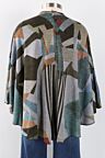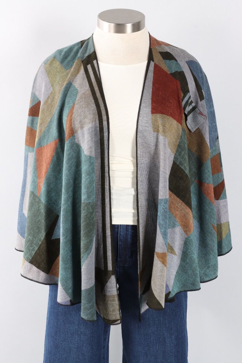 Perfect for transitioning to cooler temps, the Reversible Wrap offers cozy comfort when the winds of autumn blow. Reversible from black on one side, to a fall inspired, abstract pattern on the other, for double the styling options. A tab near the left shoulder holds the corner of the right front hemline to keep the front closed. One Size.